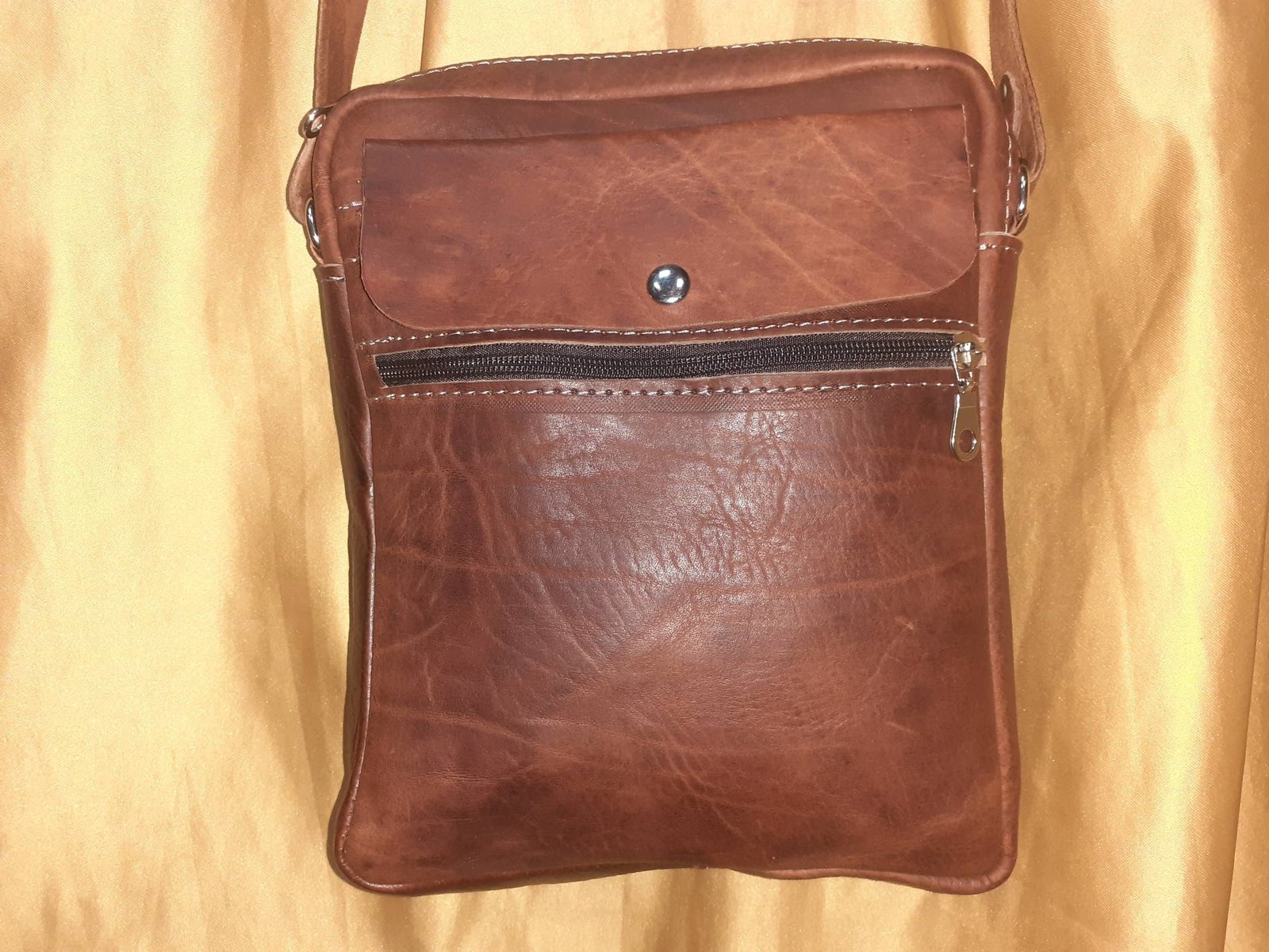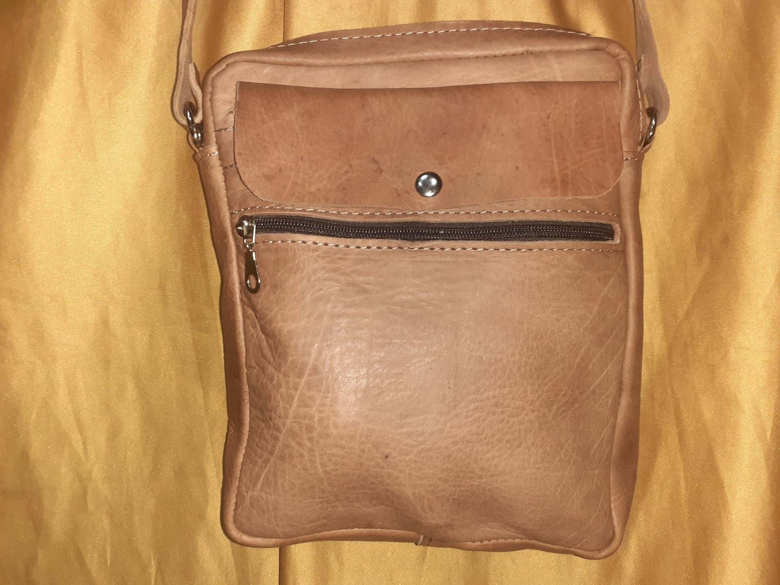 Bolso alargado de cuero de buena calidad con bolsillos en ambos frentes y un corchete y un bolsillo principal. El asa es larga para llevarlo cruzado regulable a voluntad.