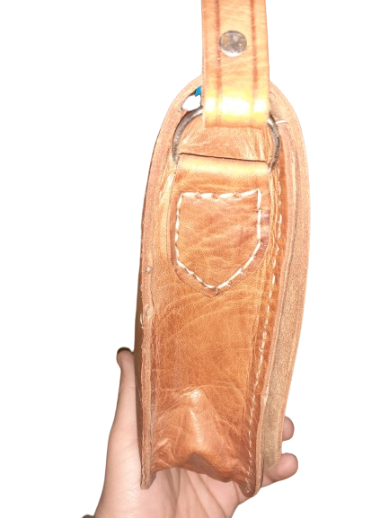 Bolso redondo de cuero vacuno de dos tipos: uno es con cierre de hebilla y el otro es con cierre de click, y son dos bolsos que caracterizan por tener un bolsillo grande y una cremallera. La cinta es larga para poder llevarlo cruzado