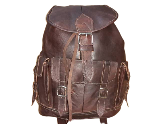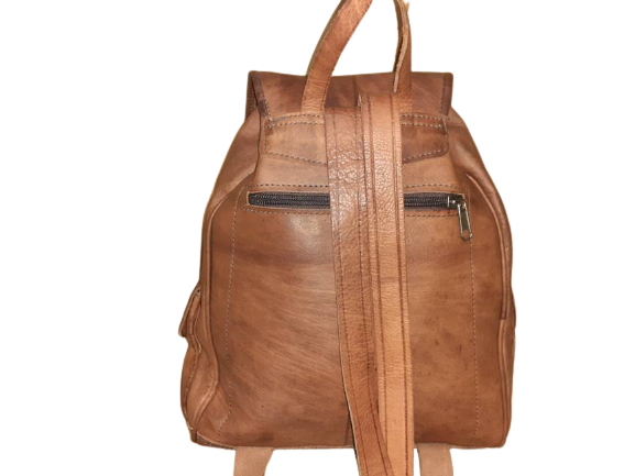 Mochila de cuero vacuno de marrakech compuesta por tres bolsillos delanteros y una cremallera trasera. En su interior esta forrada incluida en la solapa que cierra la mochila. Las tiras son muy resistentes.Sus medidas son 33 x 28 cm.